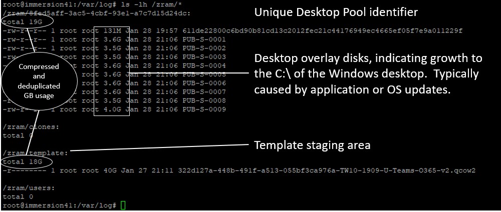- Run ls -lh /zram/* (where /zram is the mount path to the storage where desktops are deployed).